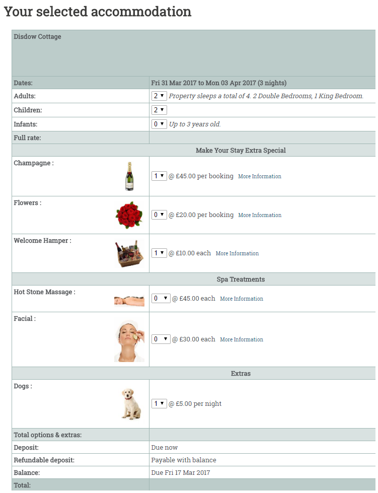 When the guest follows the booking process via your website, they will be presented with the various 'Extras' that they may choose as shown: