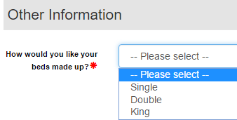 Drop down: Creates a drop down of options for the guest to choose. If your question is a simple Yes / No, you can create this as a drop down option. For example: Yes / No