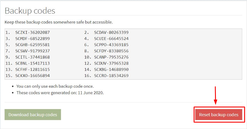 You can also reset your backup codes by simply going back to the backup codes modal and click the reset button shown below.
