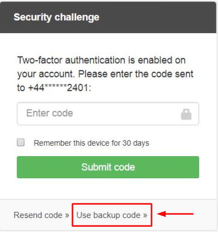Please note: when entering a backup code the *Remember this device for 30 days* will be disabled as you cannot remember a device when using a backup code.
