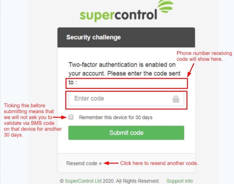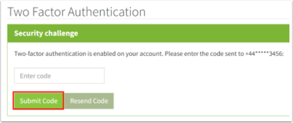 If Two Factor Authentication is enabled on your account this is where you will be prompted to enter an SMS code: