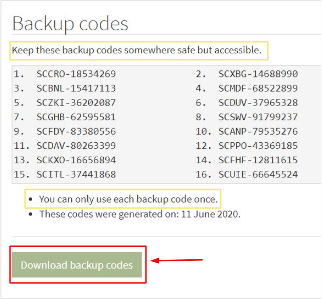 Downloading your backup codes will produce a text file that you can keep somewhere safe. If you print these codes please put them in a safe or a locked drawer.