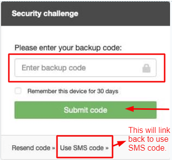 You can then enter your backup code and Submit to log in, or link back to the SMS code page.